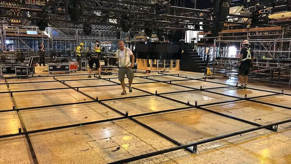 Our aluminum box-section profiles were powder-coated, CNC machined, and bent. Our client assembled the entire structure on-site into a spectacular stage. It turned out to be a spectacular show, thanks in part to this magnificent stage!